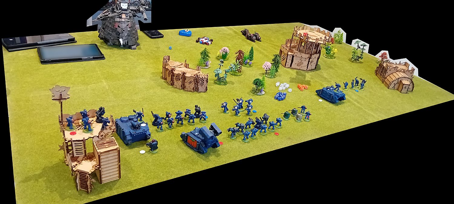 Firstly, in a roughly 1800pt game, I rocked up with a very simple Space Marine army, only to have Scoob drop a Stompa on me. Still, I was empowered by cheesburger pizza, so I gave it my best shot.