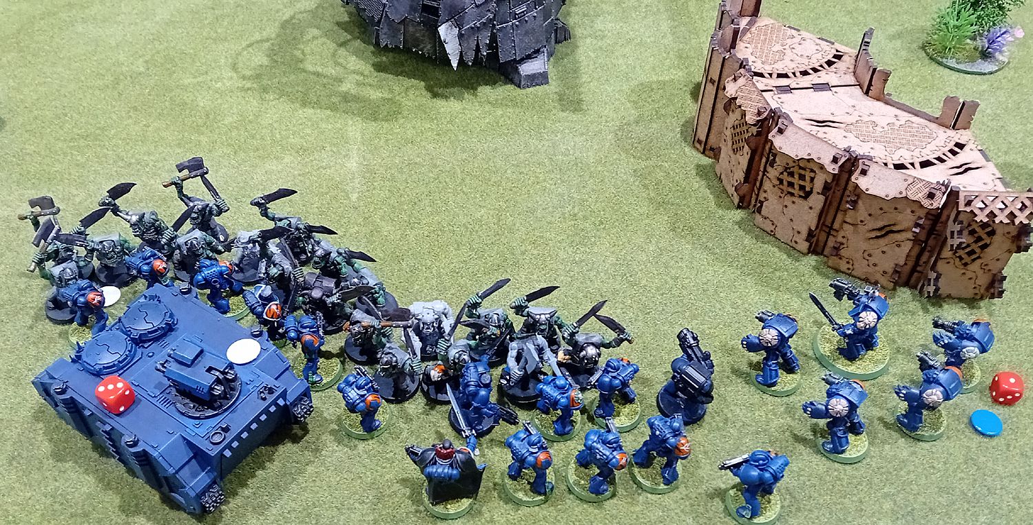 But then, while a couple of my other units tried to deal with the Ork Warbikes on the other side of the table, a horde of Ork Boyz charged out of the Stompa and into combat with my Tactical Squads, hacking a bunch down.