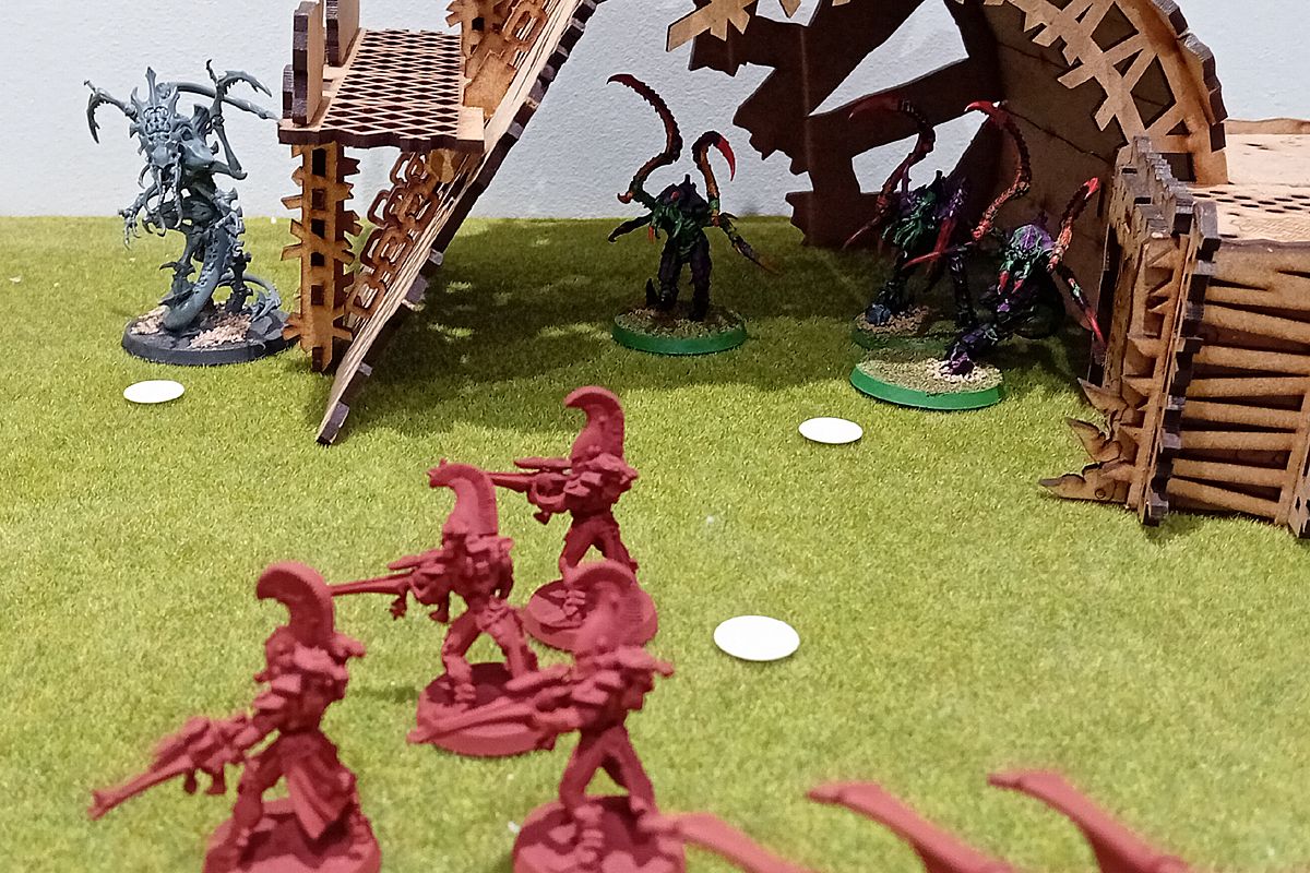 Unfortunately, with absolutely no long range firepower in my Eldar army, barring a twin Bright Lance on a Wave Serpent, I could only try and kill the Nidz by getting close. And as you may have guessed, being close to the Tyranids is exactly what they want, and my little pointy-eared lads and lasses got their faces absolutely munched on by all those bugs.