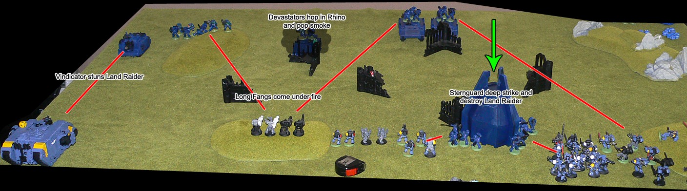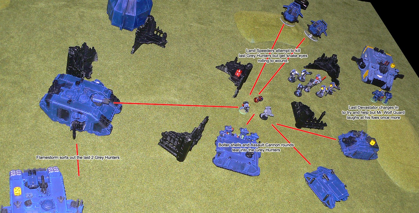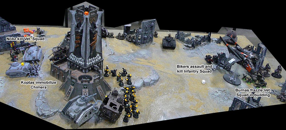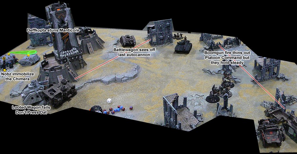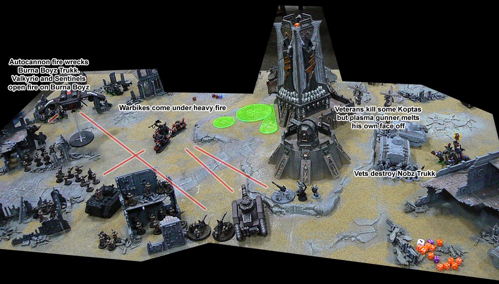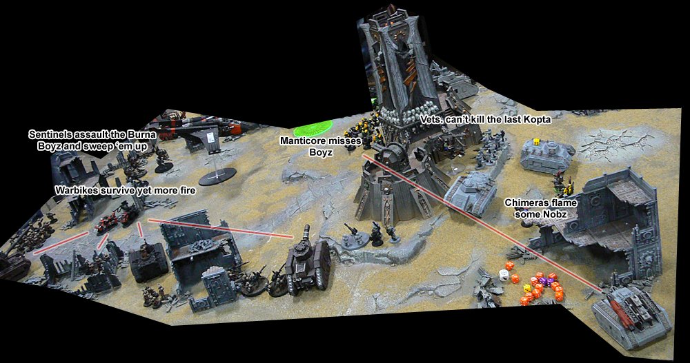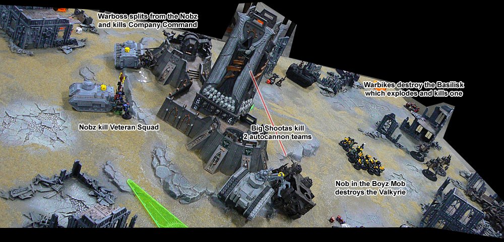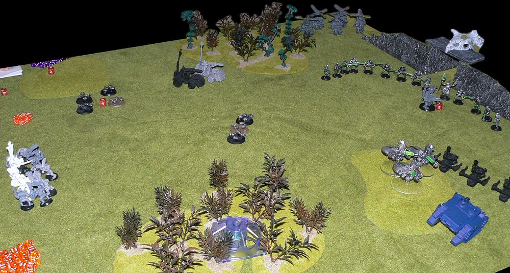 More and more Nid reinforcements started to appear all around. The large Guardsman platoon came under attack from a Lictor and managed to club it to death with their lasguns after losing several of their number, before having to destroy a brood of Gaunts that had appeared behind them. On the other flank a Carnifex charged through the rock formation there. JIK's Vindicator targeted it but missed and killed 3 Tactical Marines by accident. The Carnifex charged and killed the last 2 Marines before coming under fire from the Heavy Weapon squad. It finally fell victim to the ninja death toast fired by the Wraithlord's Shuriken Catapult.