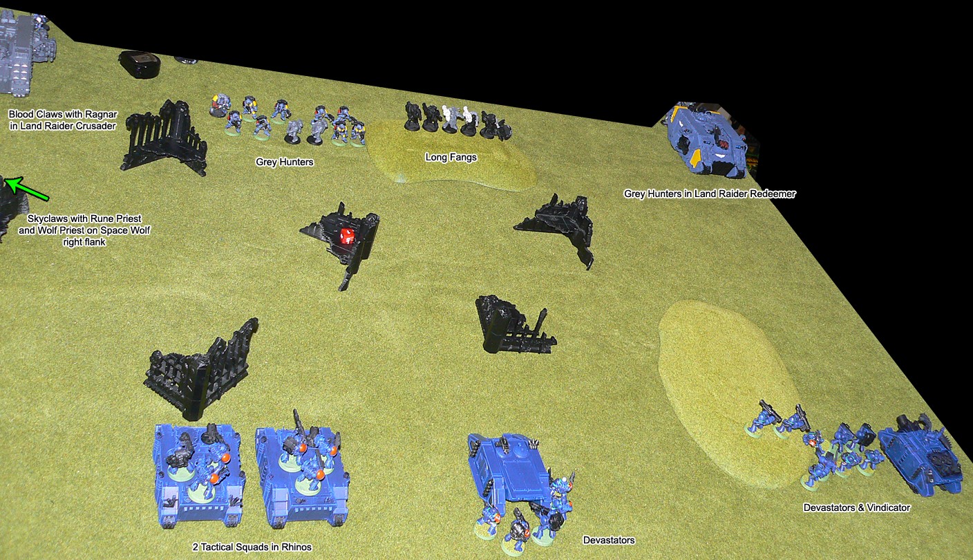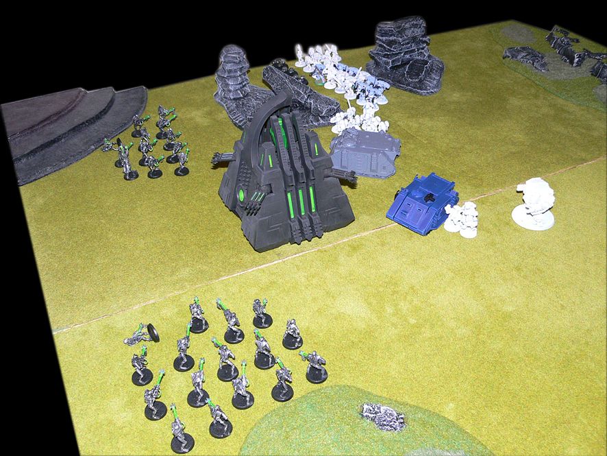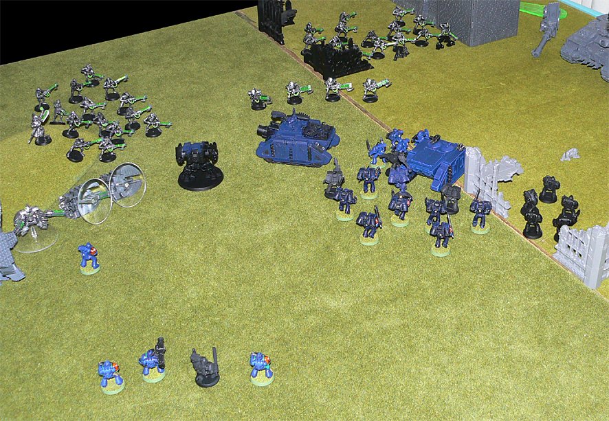On the west flank, the advance of the Assault Marines was being threatened by the presence of the Hormagaunts and Genestealers. Necron Immortal and Warrior fire soon changed that, and the Assault Marines pistols and flamers finished off the last few Genestealers.