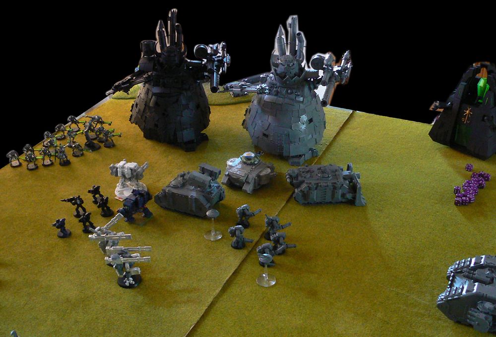Destroyed in an earlier battle against the Hive Mind, the Shadowsword "Heart Of Stone" was to be found 4 or 5 feet into the 7 foot board. We will have to get a unit to it in an attempt to retrieve critical information or a sacred relic or something, then get that unit back off our table edge to win. We will have to fight our way passed a random number of Nidz that will be present on the board from the start. And each turn a random number of Nid units will come onto the board from the far table edge. Considering it was gonna take us at least 3 or 4 turns to actually get to the Shadowsword, there's gonna be a lot of Nidz around by the time we got there...