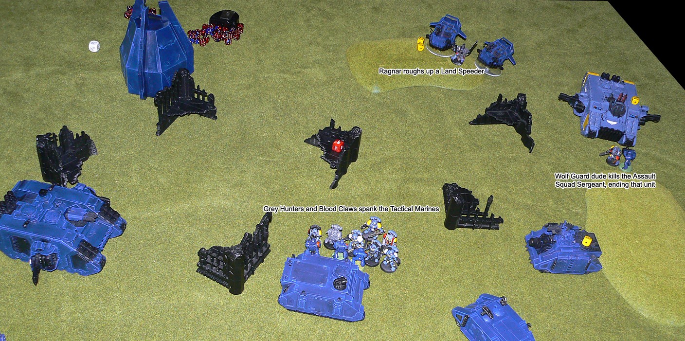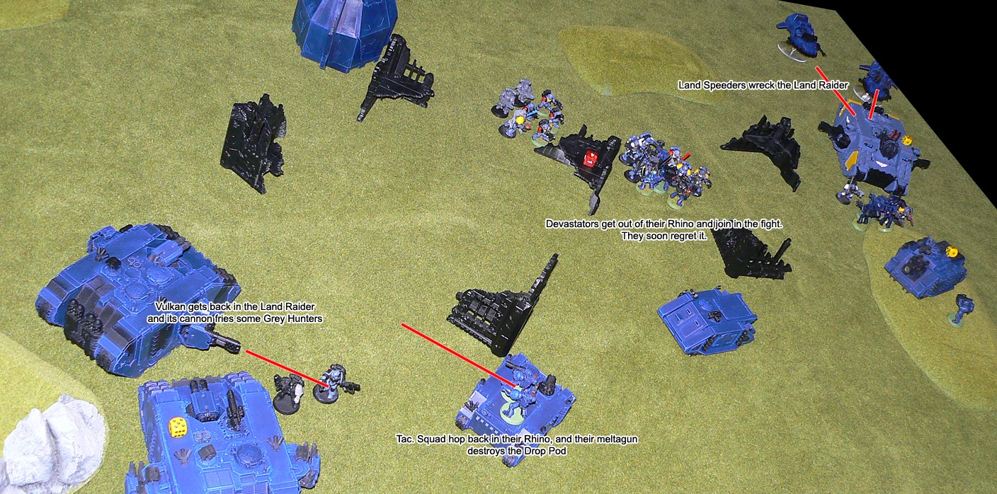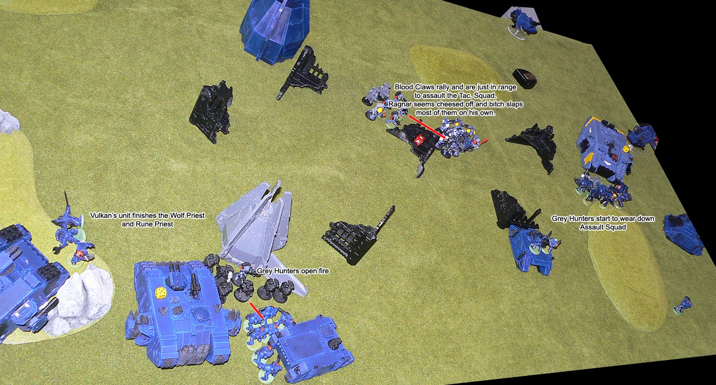The Assault Squad, weakened by a Zoanthrope's Warp Blast earlier in the battle, now decided it was time to act. They charged into the fray on the allied left flank, holding off the larger Warrior squad, 8 Hormagaunts and a Carnifex for several turns before finally being defeated. The victorious Carnifex and last Warrior crunched into the Vindicator and destroyed it spectacularly, and the explosion took out a couple of nearby Gaunts.